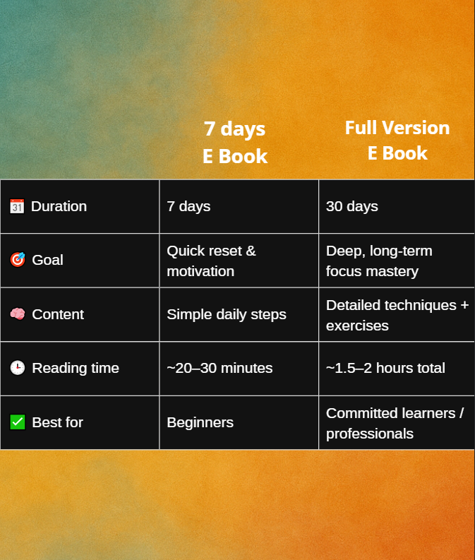 📗 7-Day Focus Reset — a short, actionable guide to quickly rebuild concentration and create strong daily habits.